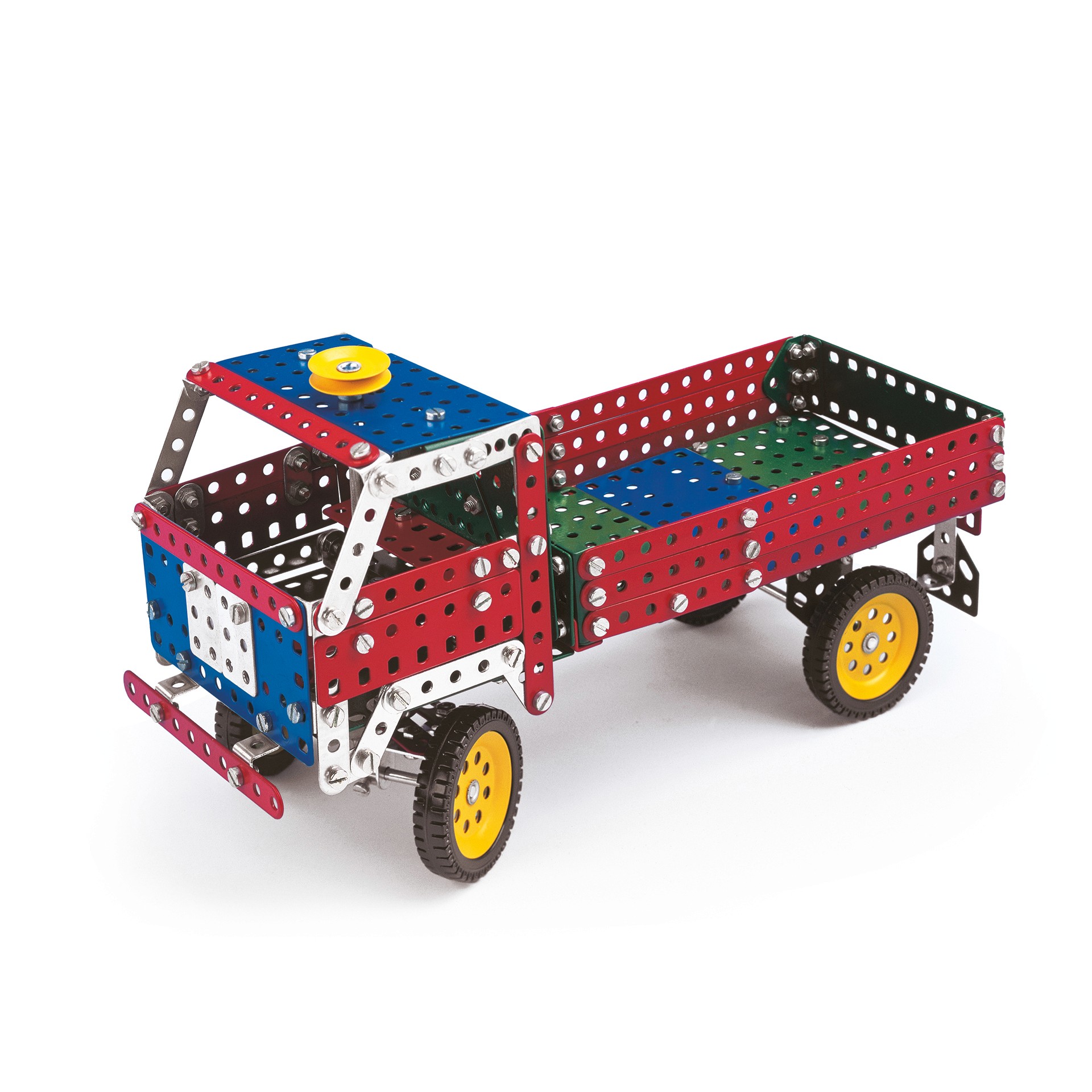Dvouvrstvá stavebnice Merkur 4. Stavebnice obsahuje mimo základní sestavu dílů také součástky nutné pro stavbu nákladních automobilů, formulí a letadel. Součástí stavebnice je samozřejmě velká návodová knížka s návodem na stavbu 40 různých modelů.
